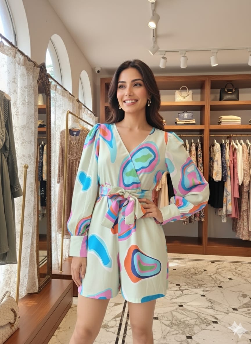 Product Details Green and pink printed playsuit with waist tie-ups ,has a v-neck, three-quarter sleeves,...