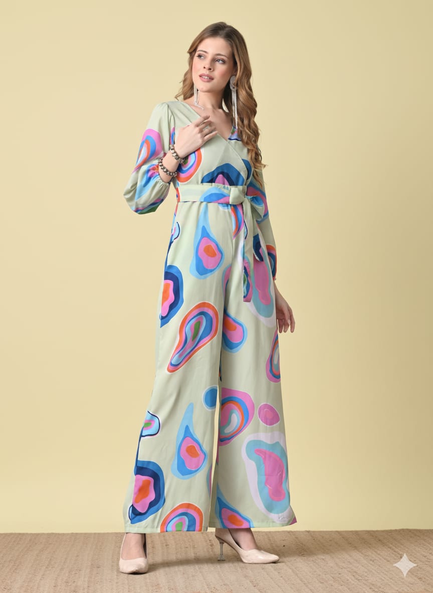 Product Details Green, pink and blue printed basic jumpsuit with waist tie-ups ,has a v-neck,...