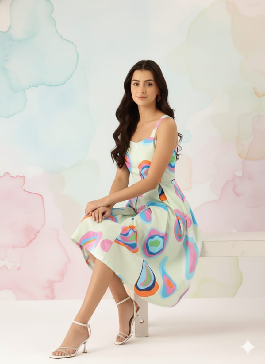 Sleek Italia Abstract Printed Square Neck Crepe Fit & Flare Midi Dress
