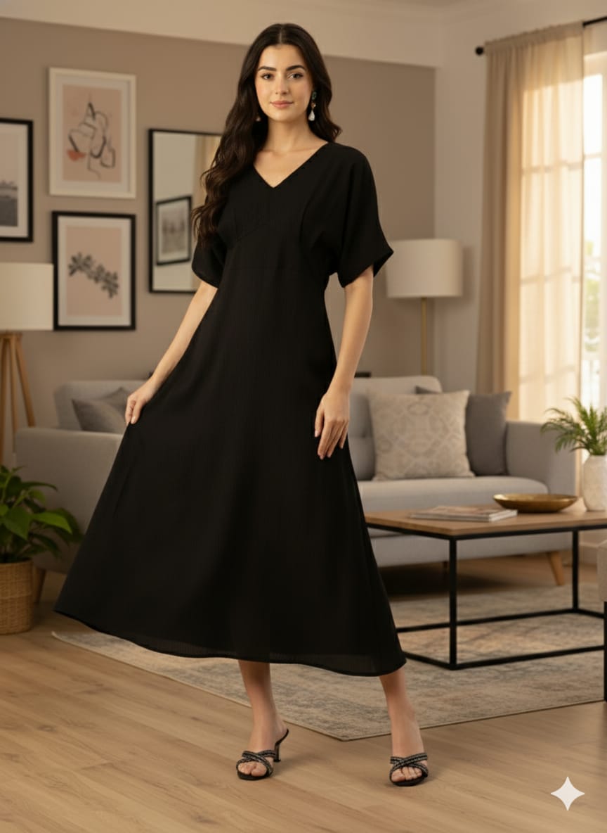 Product Details Black solid a-line dress V-neck Three-quarter, regular sleeves Gathered or pleated detail...
