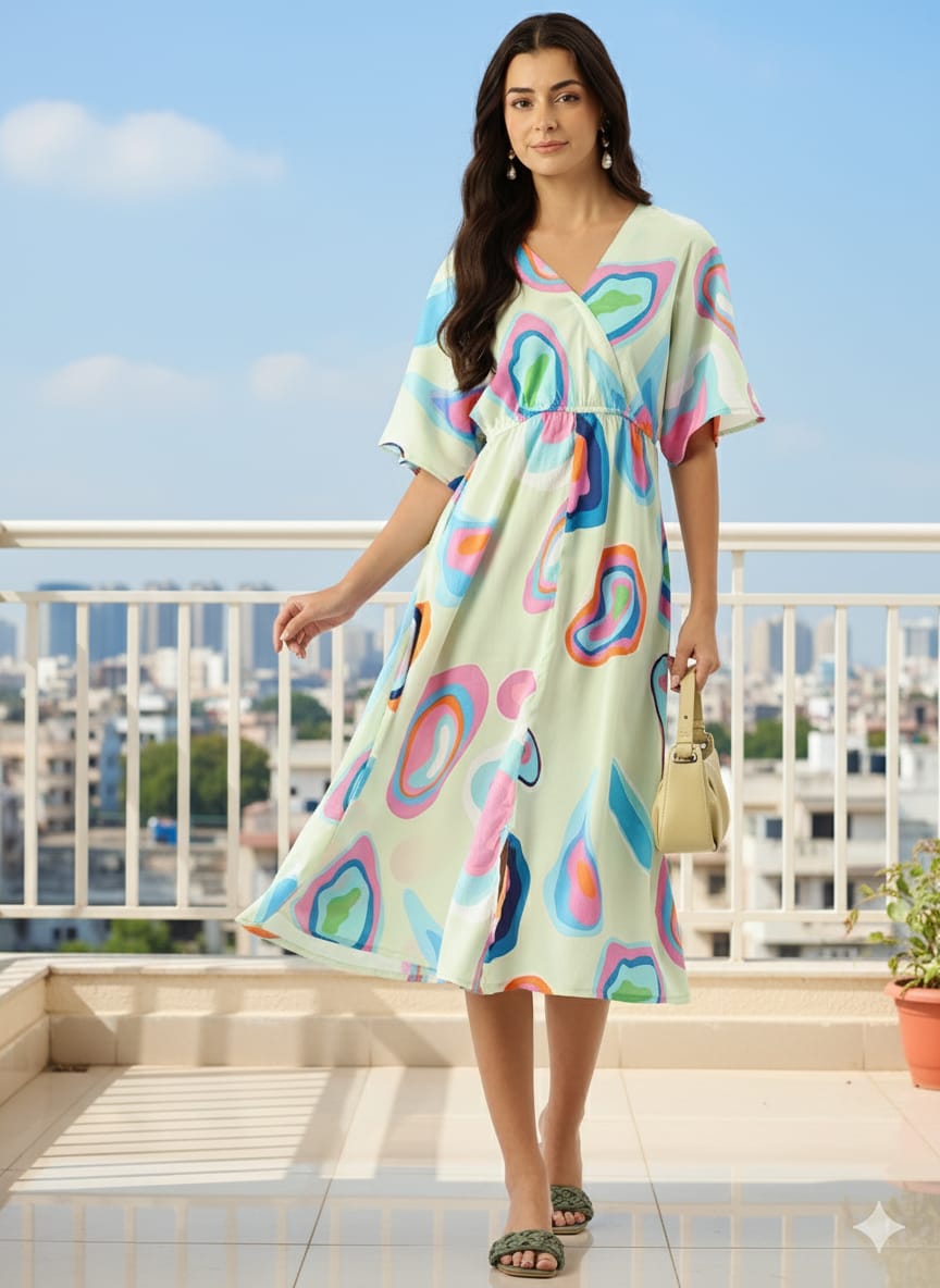 Step into timeless elegance with the Sleek Italia Floral Printed Flared Sleeve Crepe A-Line Midi...