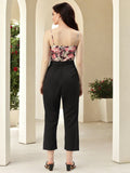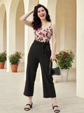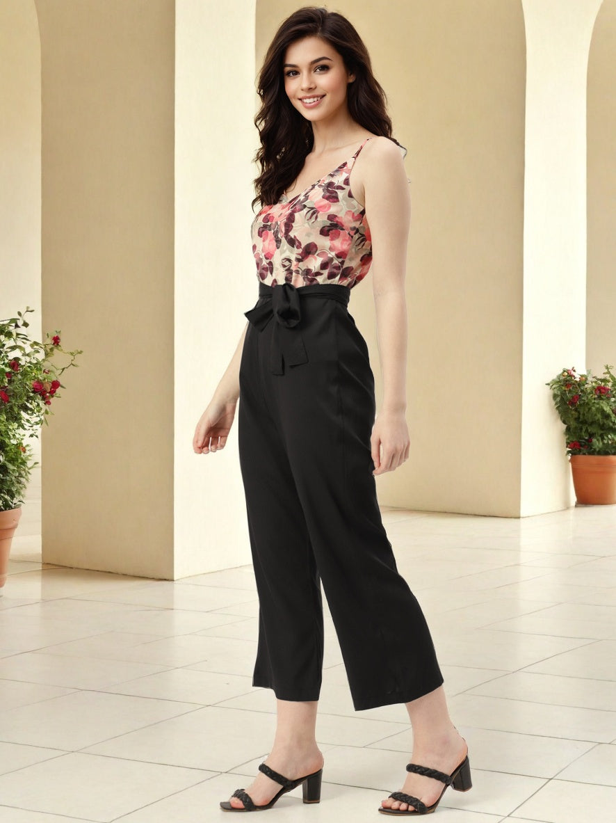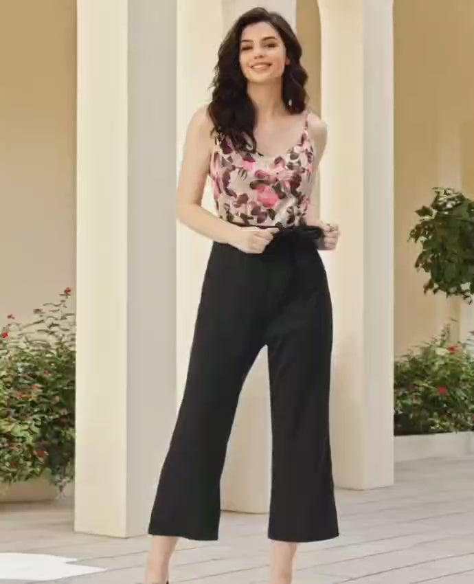 Step into chic sophistication with the Sleek Italia Floral Printed Basic Jumpsuit, blending feminine florals with timeless elegance. This stylish one-piece features a camisole-style floral printed bodice paired with sleek solid black wide-leg bottoms, creating the illusion of a top-and-trouser set while offering the ease of a jumpsuit. The tie-up waist belt cinches beautifully, ensuring a flattering silhouette for every occasion.