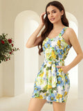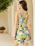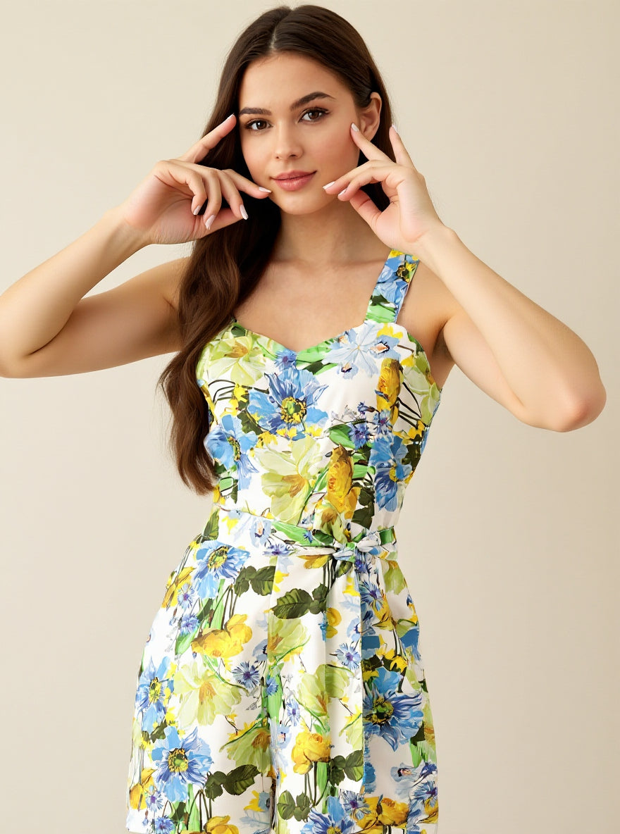 is designed to brighten up your warm-weather wardrobe. Featuring a lively mix of yellow and blue florals against a crisp white backdrop, this romper perfectly balances playful charm with feminine elegance. The sweetheart neckline with wide straps adds a flattering touch, while the tie-up waist belt enhances your silhouette for a comfortable yet stylish fit.