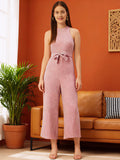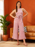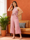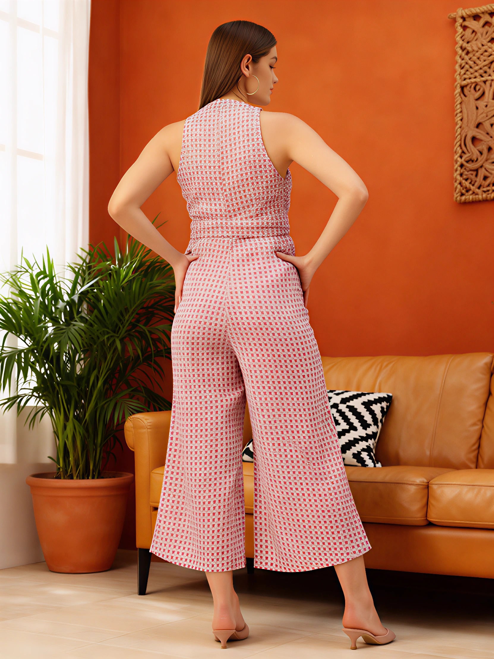 White and pink checked culotte jumpsuit with waist tie-ups ,has a round neck, sleeveless, pockets