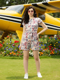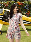 Beige and blue printed playsuit with belted detail ,has a round neck, short sleeves