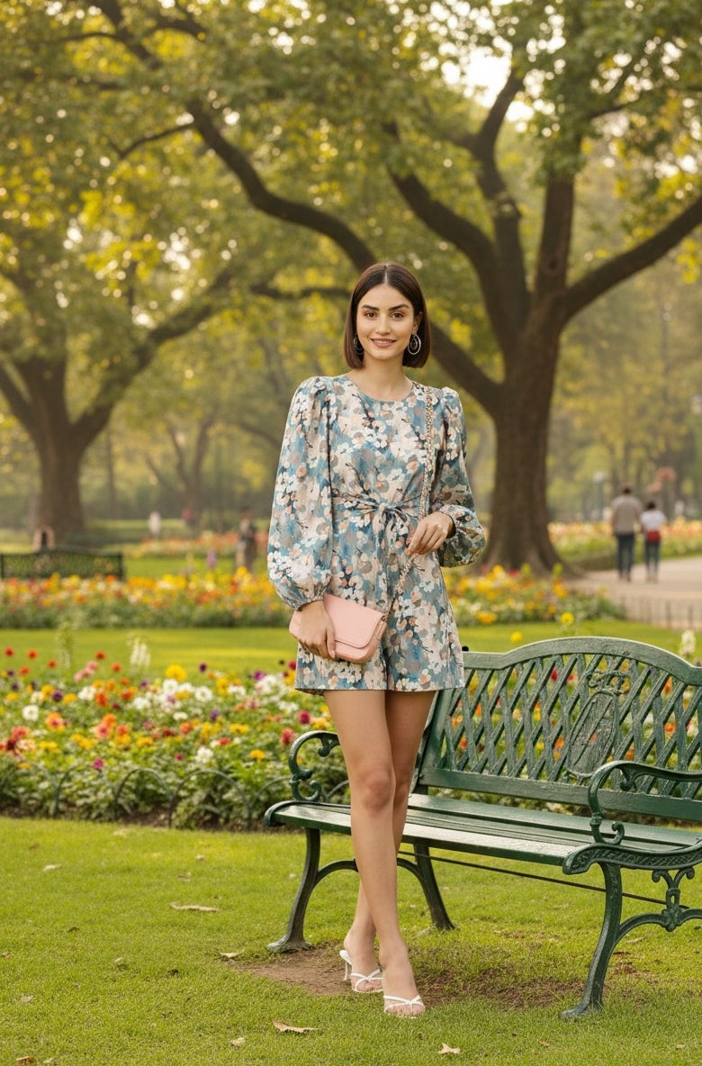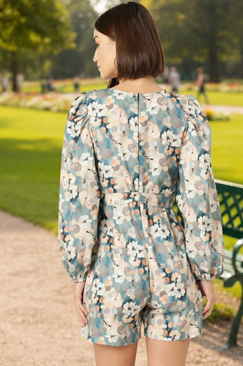 Blue printed playsuit with waist tie-ups ,has a round neck, long sleeves, pockets