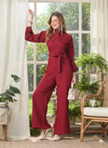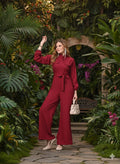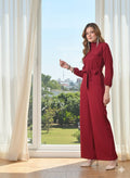 Sleek Italia Maroon Mandarin Collar Long Sleeves Waist Tie-Ups Basic Jumpsuit