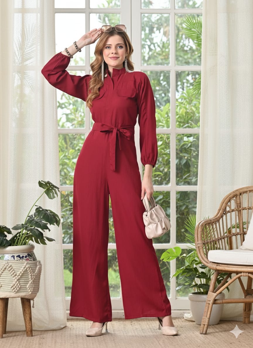 Maroon solid basic jumpsuit with waist tie-ups ,has a mandarin collar, long sleeves, na pockets