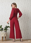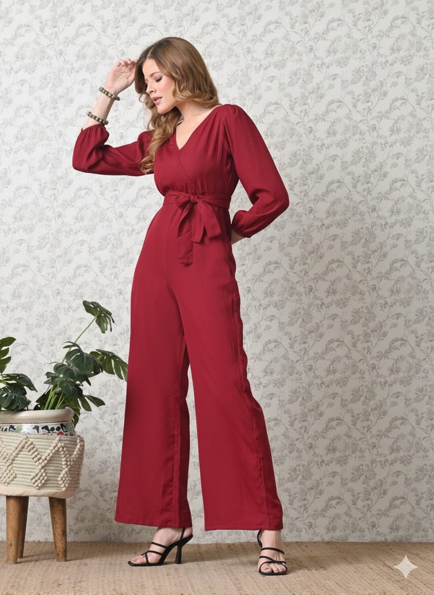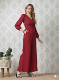 Sleek Italia Maroon V Neck Three-Quarter Sleeves Waist Tie-Ups Basic Jumpsuit