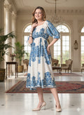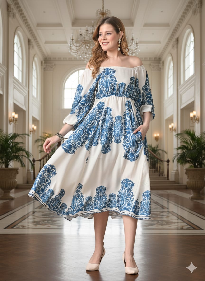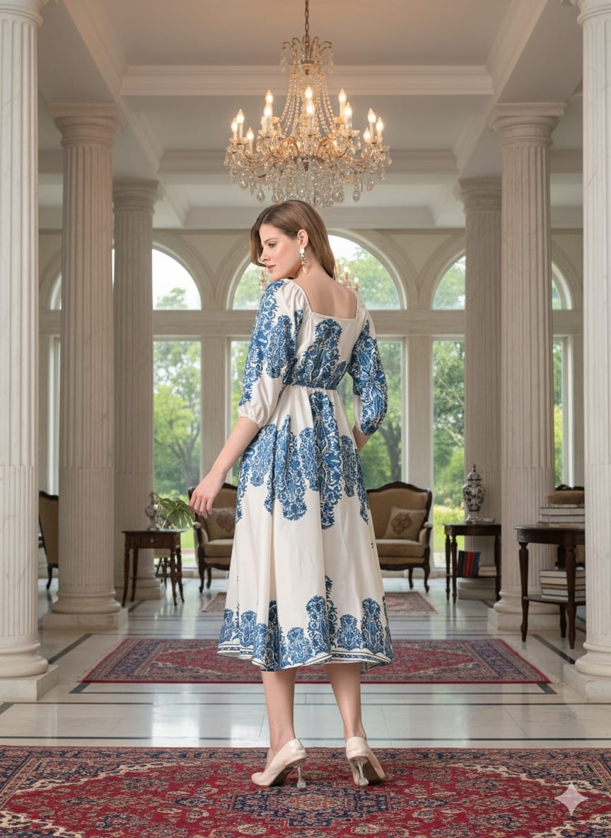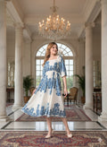 Sleek Italia White and Blue Print Crepe Fit & Flare Midi Dress