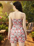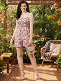 Pink and white printed playsuit ,has a shoulder straps, sleeveless, na pockets