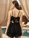 Black solid playsuit with waist tie-ups ,has a shoulder straps, sleeveless, pockets