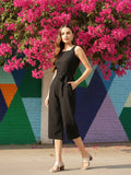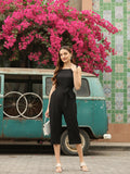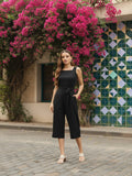 Black solid capri jumpsuit with waist tie-ups ,has a square neck, sleeveless, 2 pockets
