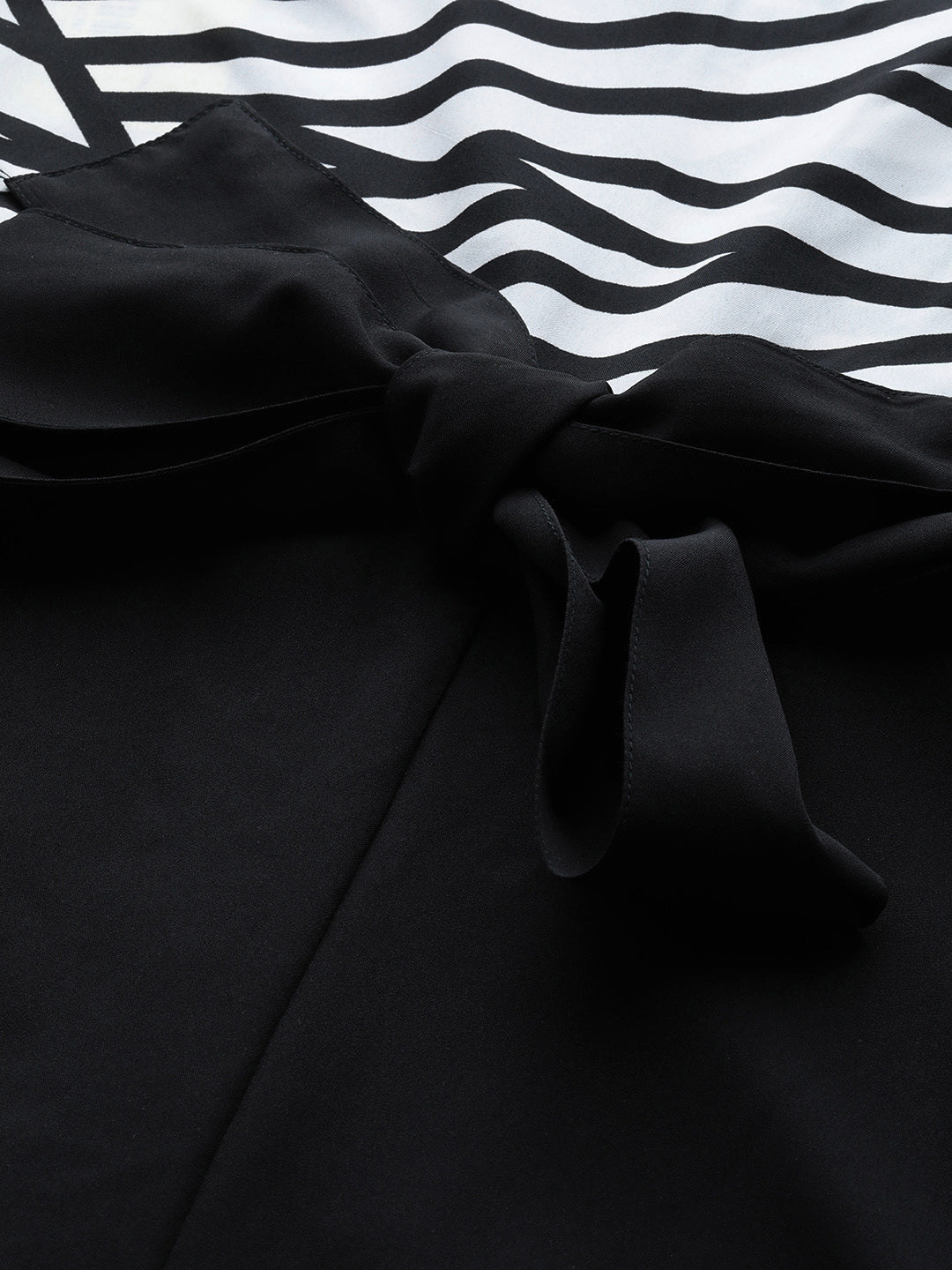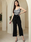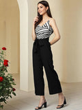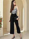 This striped jumpsuit features a flattering tie-up detail that enhances the waistline for a tailored fit. Crafted for comfort and style, its breathable fabric and sleek design make it ideal for both casual outings and sophisticated events. The vertical stripes