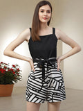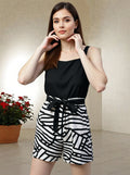 Upgrade your casual wardrobe with this chic sleeveless playsuit. Designed with a solid black top and bold black & white geometric printed shorts, it features a stylish square neckline and a matching waist tie for a flattering fit. Perfect for day outings, vacations, or casual gatherings, this playsuit combines comfort with a modern trendy look.